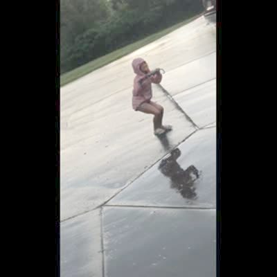 A young girl throws her umbrella in the air and catches it as she dabs.