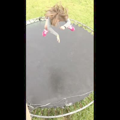 A young girl jumps up and down on a trampoline in slow motion. A Great Dane puppy dog jumps on to the trampoline and knocks her down. slo-mo