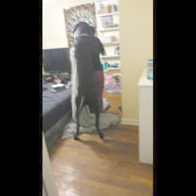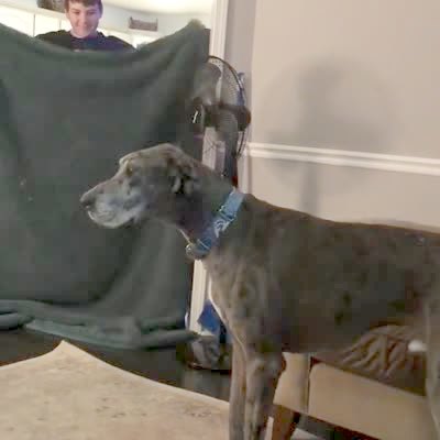 A woman holds a blanket over herself do the What The Fluff Challenge to her Great Dane dog and he jumps on her.