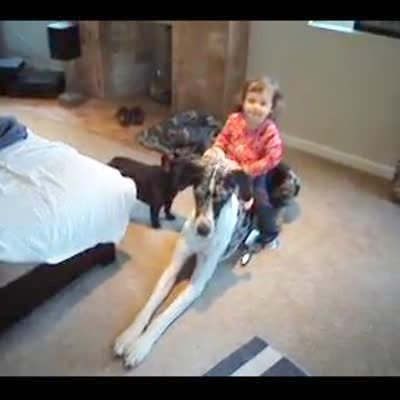 Little girl sits on the back of a Great Dane laying on the floor. When the dog stands up, girl gets knocked off.
