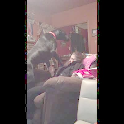 A Great Dane dog climbs on a chair that a teen girl is sitting on and sits on her head.