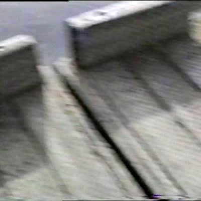 A Great Dane dog falls down the stairs in the house. Security footage.