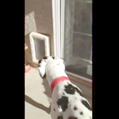 A Great Dane dog refuses to walk through a dog door and opens the door to a house.