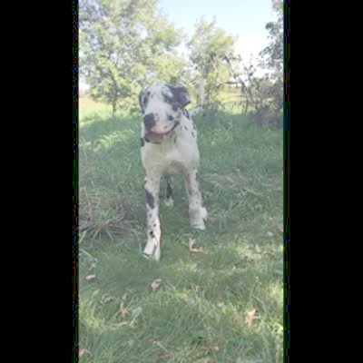 A rat terrier dog pees on a great Dane dog as they both pee outside. Action at :30.