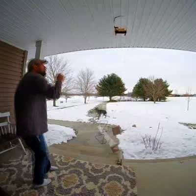 A man takes his dogs out for a walk when his Great Dane takes off on his leash, which is wrapped around a front porch post. He pulls the entire pole down as he runs. Security footage.