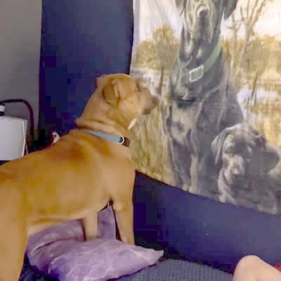 Two dogs bark at the image of two dogs on a wall at home.