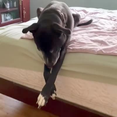 A woman lies on a hammock in the backyard, and a Great Dane dog crawls onto the hammock with her. The dog steps over her, then jumps off and the hammock falls to the ground.
