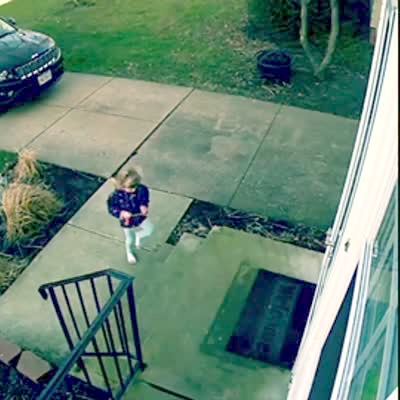 A young girl slips and falls down front porch steps on a rainy day as she waits at a front door. Security footage.