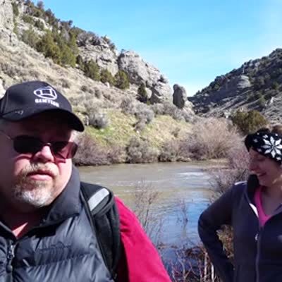 A man and woman talk to the camera about his day and animals that he saw. He says that they walked across a river because it was too deep to drive across and the camera pans to the river, where his truck is stuck, in the water.