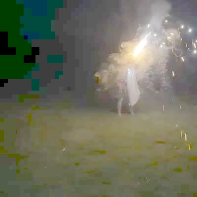 A teen boy holds a firework in his hand in a yard and screams while sparks fly everywhere. The explosion gets bigger, then he drops it and runs.
