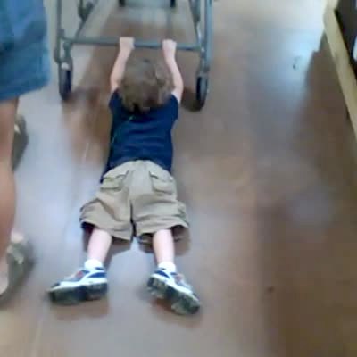Baby boy holds on to the bottom bar of a shopping cart and gets dragged along the department store floor on his stomach.