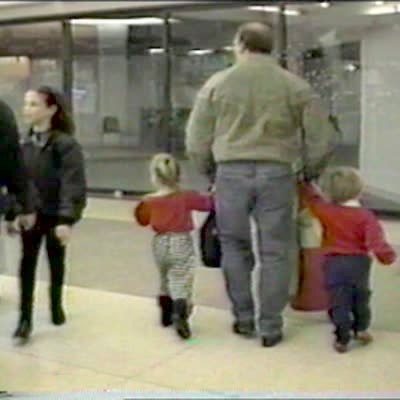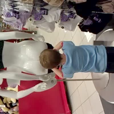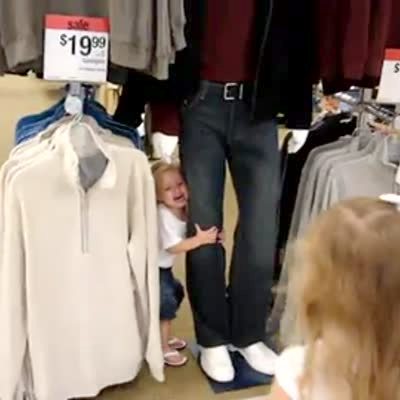 "Department Store Daddy" Tot girl thinks headless mannequin is her dad, calls it Dada. She doesn't want to leave clothing store without him, holds onto mannequin's leg & cries while her brother tries to pull her away.