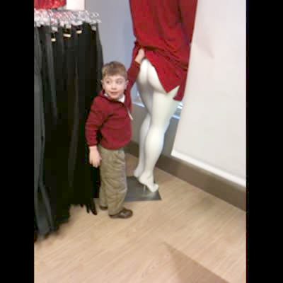 Tot boy pulls down the underwear on a mannequin down so he can see its butt. Shot sideways.