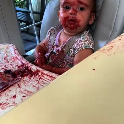 A baby girl in a high chair is completely covered in purple colored food. Her mother asks if it was tasty and the baby girl smiles.