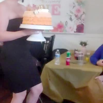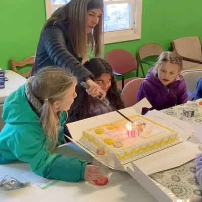 A group of young girls sing "Happy Birthday" at a birthday party while a woman struggles to light the birthday candles, and they hold a note at the end of the song while they wait for the woman to finish.