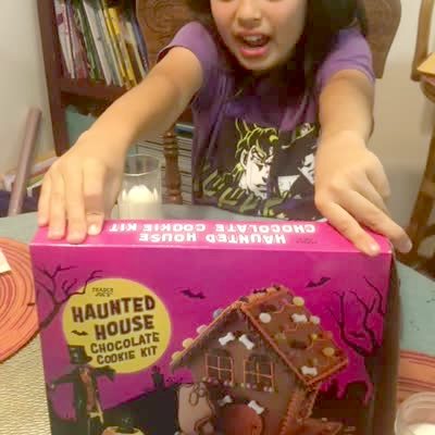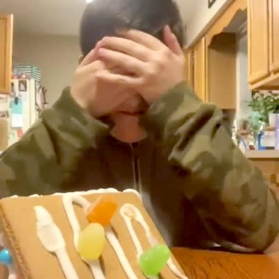 A young boy holds a box for a gingerbread house and a woman says she can't wait to see what he did. He says "this is pretty good for a child" and he slowly lifts the box to reveal the pieces of the house lying on a plate unassembled in the dining-room. Then says "Nailed it!"
