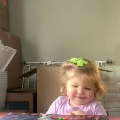A woman puts two M&M's on the table in front of a young girl and says not to touch them while she is in the bathroom. She walks out of the living room. The girl peeks over then grabs the M&M's and puts them in her mouth. The woman reappears and catches her. The girl freezes and makes a face.