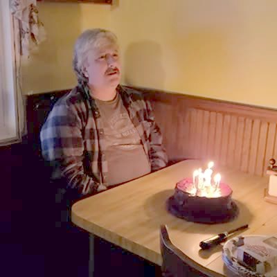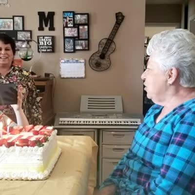 A senior woman sits in front of a birthday cake with candles in a dining room. She says "I got no wind left" before she blows out the candles, and she farts while she blows on them.