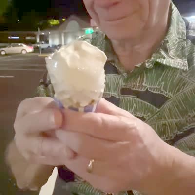 A senior man outside struggles to take the wrapper off his ice cream cone. The cone breaks and the ice cream falls on the table.