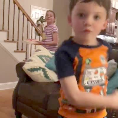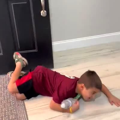 A young boy is startled/scared when he comes in through the front door. He falls to ground then ends up throwing his water bottle at his dad.