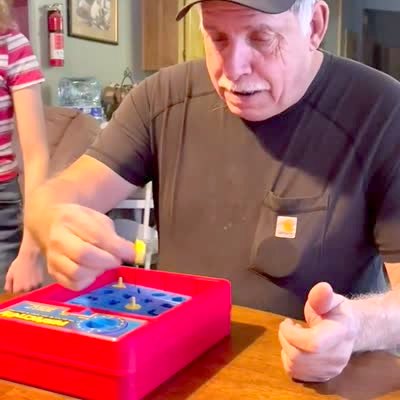 A senior man plays "Perfection" at a dining table. He jumps and throws his hat off when the game pops as he loses.