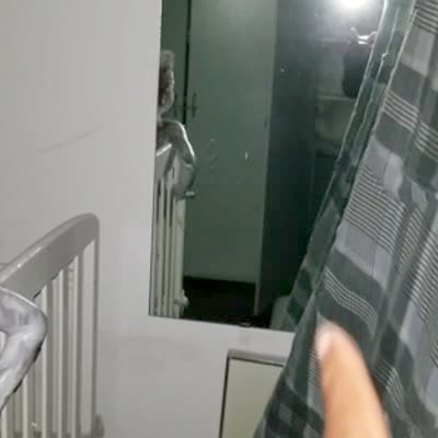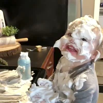 A woman walks into a room to find a tot boy in a crib covered in diaper rash cream. When he sees himself in the mirror he cries.