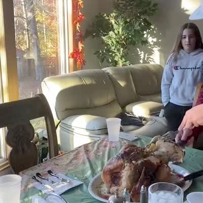 A man carves turkey for Thanksgiving dinner in a dining room, then he pretends to find a baby turkey inside of it, but it is a chicken. Ayoung woman believes it until a woman says that turkeys lay eggs.