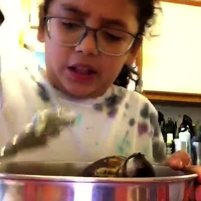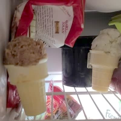 A mother plays a prank on her two young sons, giving one of the boys frozen mashed potatoes and the other refried beans that have been frozen in the shape of ice cream.