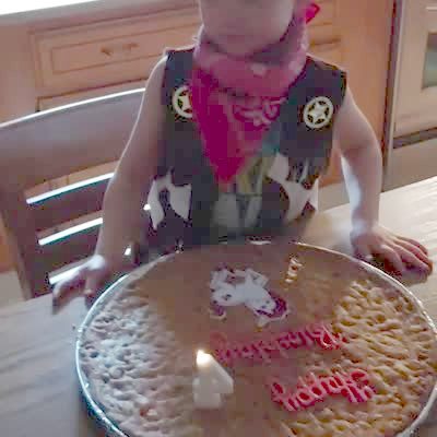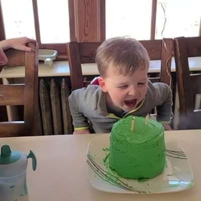 Adults offscreen sing "Happy Birthday" to a young boy who sits in a chair with a cake in front of him. He blows out the candle and falls out of his chair.