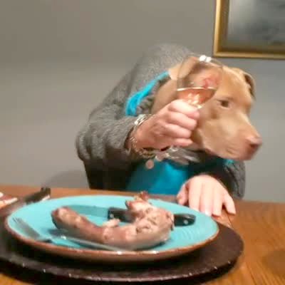 A dog with human hands sits at a dining room table while it toasts to others and eats its Thanksgiving meal. Dogs with Human Hands
