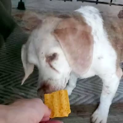 A woman holds a chip out on the outside of a sliding glass door. A dog inside tries to bite it.