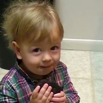 A young boy eats a brownie while he stands in a pile of the other brownies that tumbled to the ground when he pulled them off the counter. Mother films him and asks what happened to the brownies.