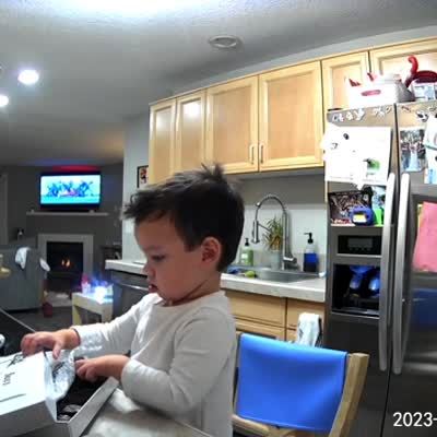 A young boy pushes a chair over to a kitchen counter, grabs a box of chocolate, and looks inside. He puts it back, then grabs one piece and takes small bites. His young girl sister comes over to tell him "no." Security footage.