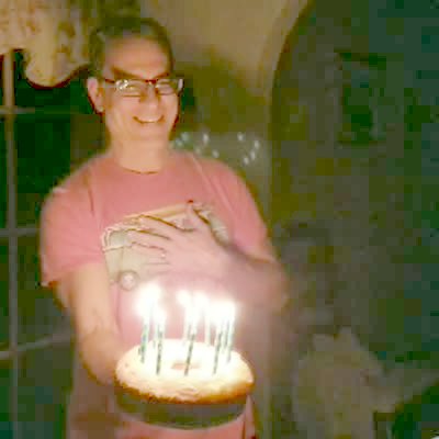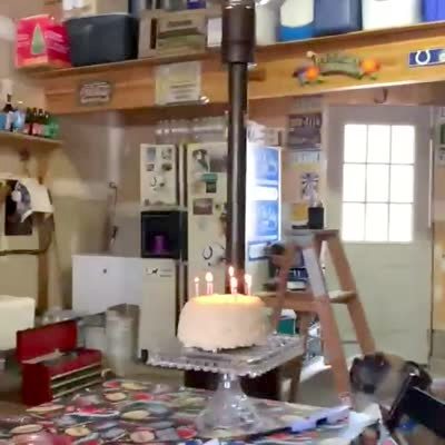 A man uses an air horn to blow out his birthday candles in the kitchen, and it turns into a flamethrower.