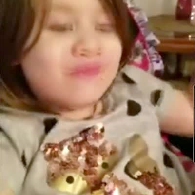 A woman in the dining room tells a young girl to smell a cupcake and when she does, the woman dunks her head into it. The aunt tells the niece she didn't smell it good enough and when the niece smells it again, the aunt dunks her again. The cupcake sticks her her face and glasses.