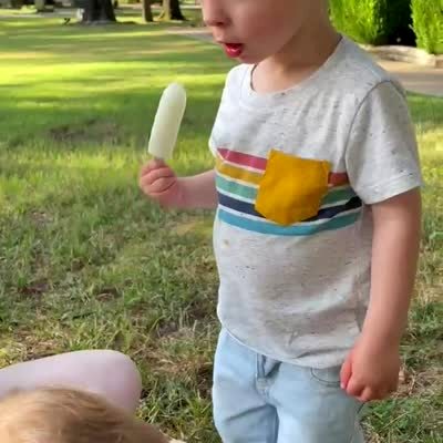 A tot boy holds a popsicle and man says that it's a nice popsicle and asks him to give his baby brother a lick. The boy then licks the younger boy's head.