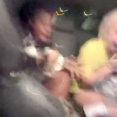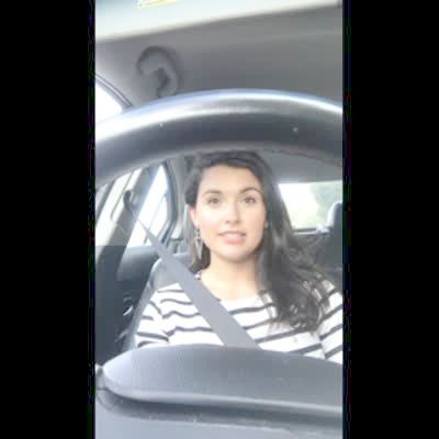 A woman gasps in the car when she spills bread pudding all over her dress after the lid of the plastic container it's in comes off while filming a vlog.