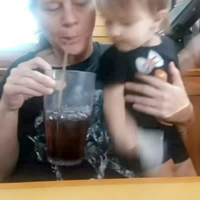 A woman sips a soda while she holds a tot girl at a booth in a restaurant. The tot girl takes a napkin, wipes down the table and places the napkin into the woman's cup. The woman makes a face to the camera, then takes a sip.
