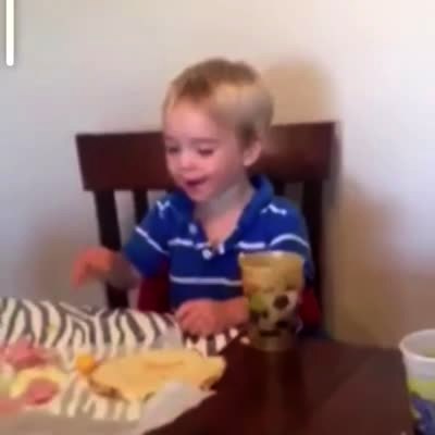 A young boy knocks a cake off the dining room table. When a woman asks the son how it got there, the son pretends he heard someone knock at the door. The son insists he can still eat it and eats it off the floor.