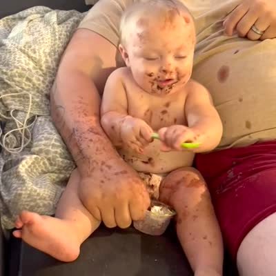 A dad falls asleep on "baby duty" so the baby girl gets Oreos and applesauce all over herself and the man.