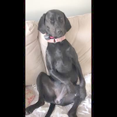 A woman confronts her bulldog dog and says "who did that" and the dog raises her paw and then sits in front of a tear in the couch.