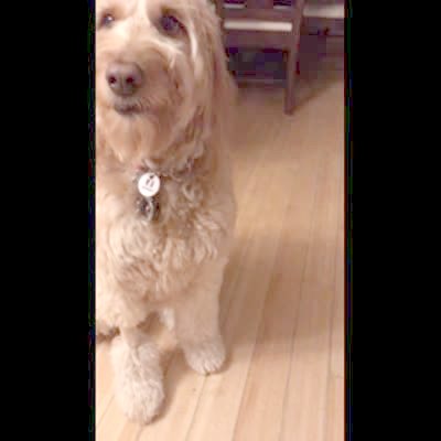 A dog sits in the kitchen and smiles when a woman asks him "did you do something bad?".