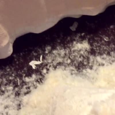 A man films a destroyed feather pillow in a bedroom and asks two black Labrador dogs if they did it and one of the dogs has feathers all over its face in a house.