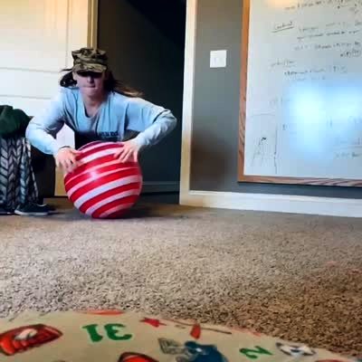 A woman jumps onto a rubber ball in slow motion, it pops and she falls on the floor, then her young child off screen says, "Mommy, why did you pop it?".