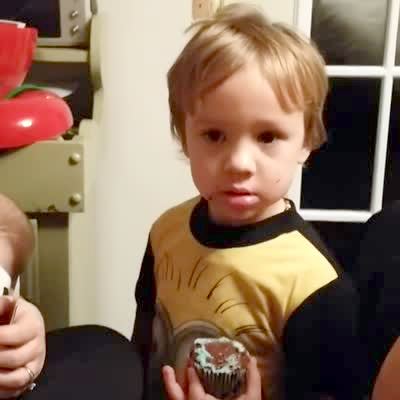 A tot boy with frosting on his face blames his tot brother and says that some of the frosting fell on his face. His dad asks the brother of he did in fact eat the cupcake and the boy says yes.