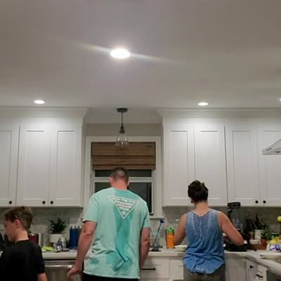 A man lays in a hammock in the basement and a pole rips away from the wall and he falls and a woman on the steps stomps her foot and says "what did I just say!". Security footage.