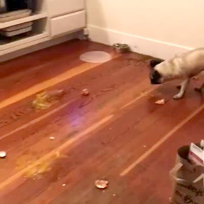 A man explores a mess of candy all over the living room floor and asks his pet Labrador if she did it. The dog spits a lollipop out.