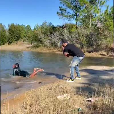 A man and woman prepare to do a trust fall in front of a lake while music plays, then the woman falls forward into the lake instead of back in the man's arms, and she yells at him because he did not catch her. Music rights not cleared.