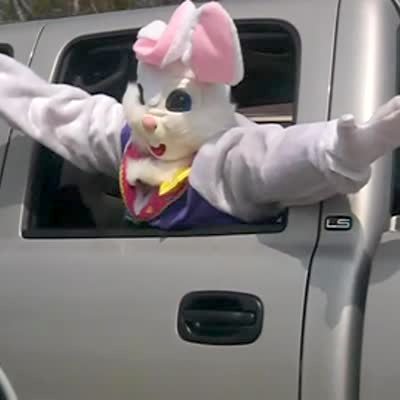 A woman in an Easter bunny costume leans out of a truck window and dances. Tot boy in the car says, "Hi Easter bunny."