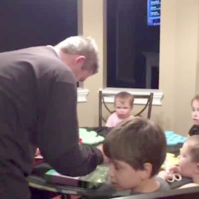 A young girl passes gas when she climbs a cabinet during an Easter egg hunt with a tot girl in the living room.